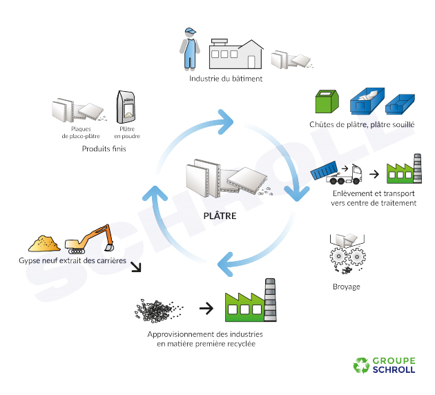 Avec le plâtre, les usines de recyclage refont… du plâtre, tout simplement. Il est incorporé à la fabrication de nouvelles plaques de plâtre par exemple et permet donc l’économie de matières premières.
