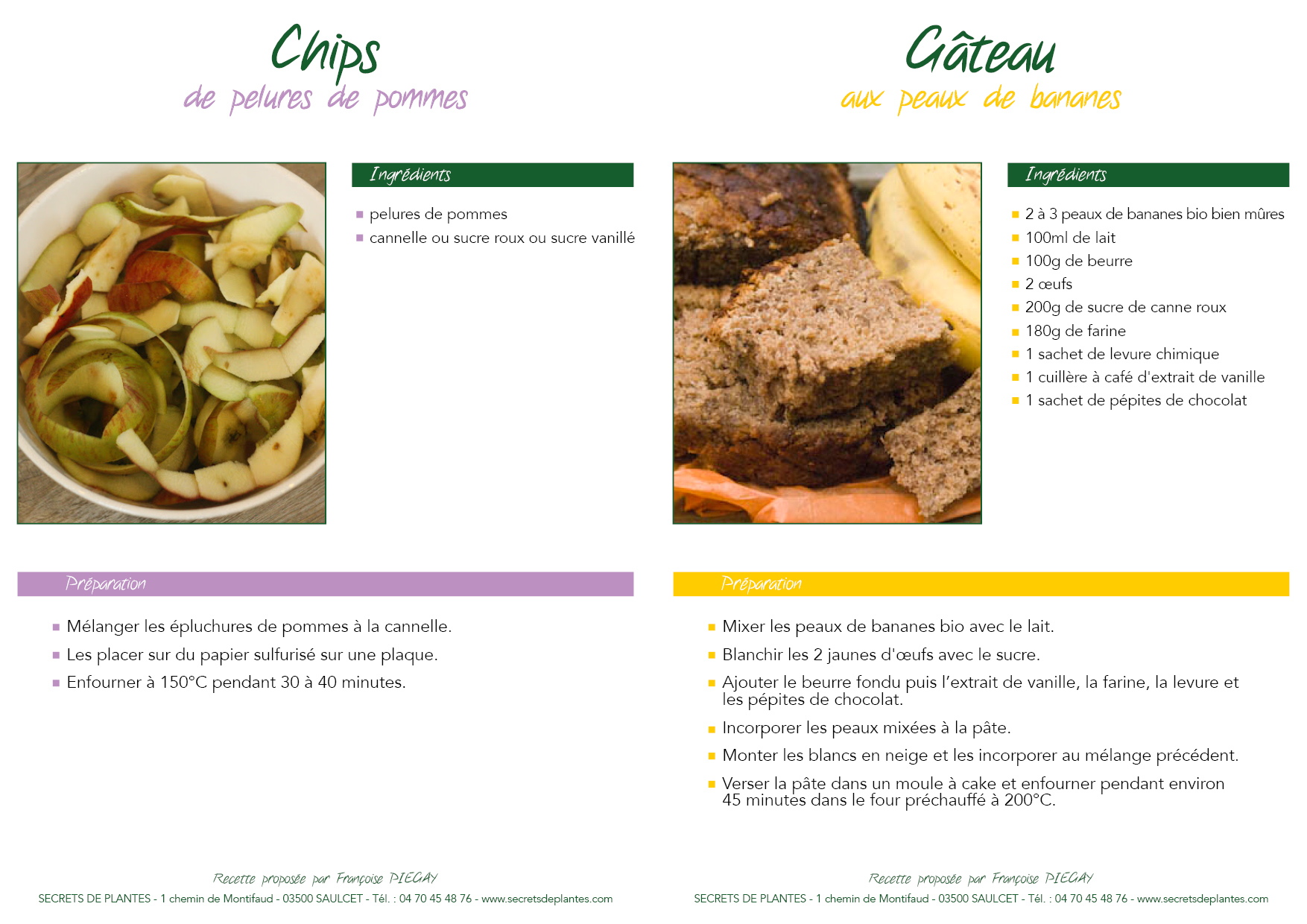 Télécharger les recettes : chips aux pelures de pommes et gâteau à la peau de banane