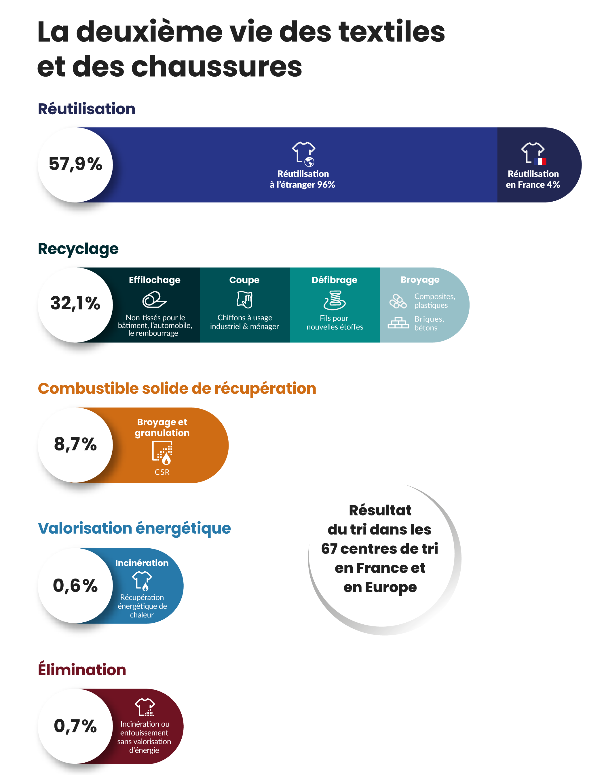 Les articles en moins bon état seront transformés en nouvelles matières : fil, géotextile pour l’industrie du bâtiment ou de l’automobile, plasturgie / composite pour de nouveaux objets, valorisation énergétique.